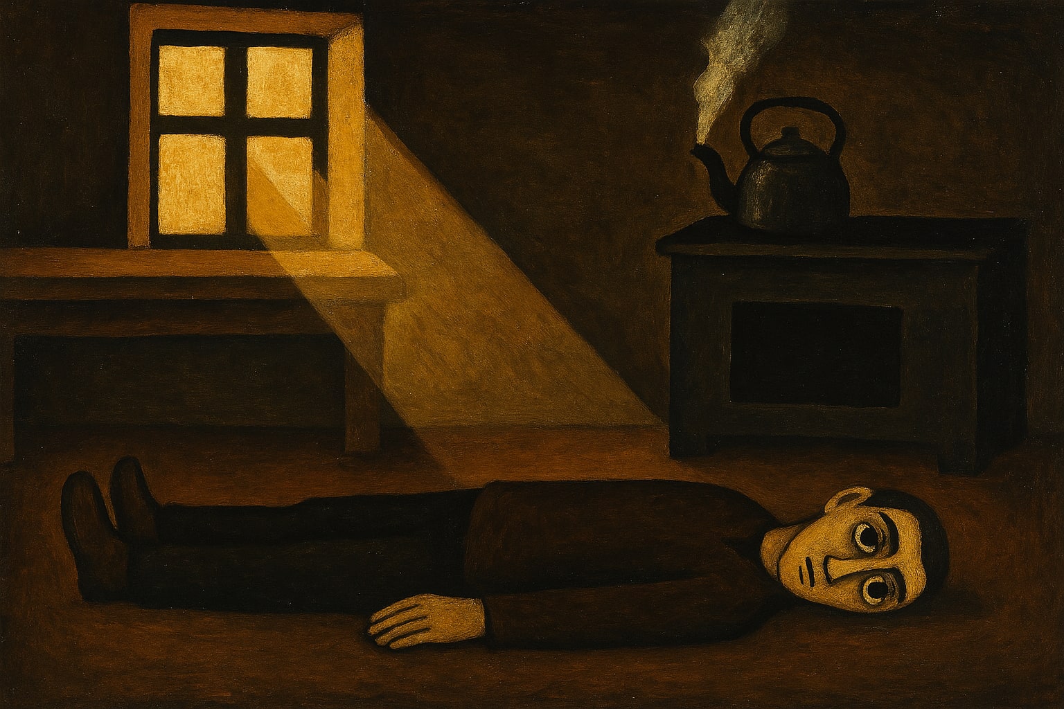 Exkurs: Bartleby. — Herman Melville, 1853. Ein Schreiber in einer New Yorker Kanzlei, der eines Tages beginnt, Aufträge mit dem Satz zu verweigern: »I would prefer not to.« Keine Begründung. Kein Gegenvorschlag. Keine Alternative. Nur: Ich möchte lieber nicht. — Der Körper des Geschäftsführers aus Limburg formulierte es am fraglichen Morgen noch knapper. Er sagte nicht einmal »I would prefer not to.« Er lag einfach da. Das ist die radikalere Version. Bartleby ohne Text. Streik ohne Sprache. Reiner Körper.