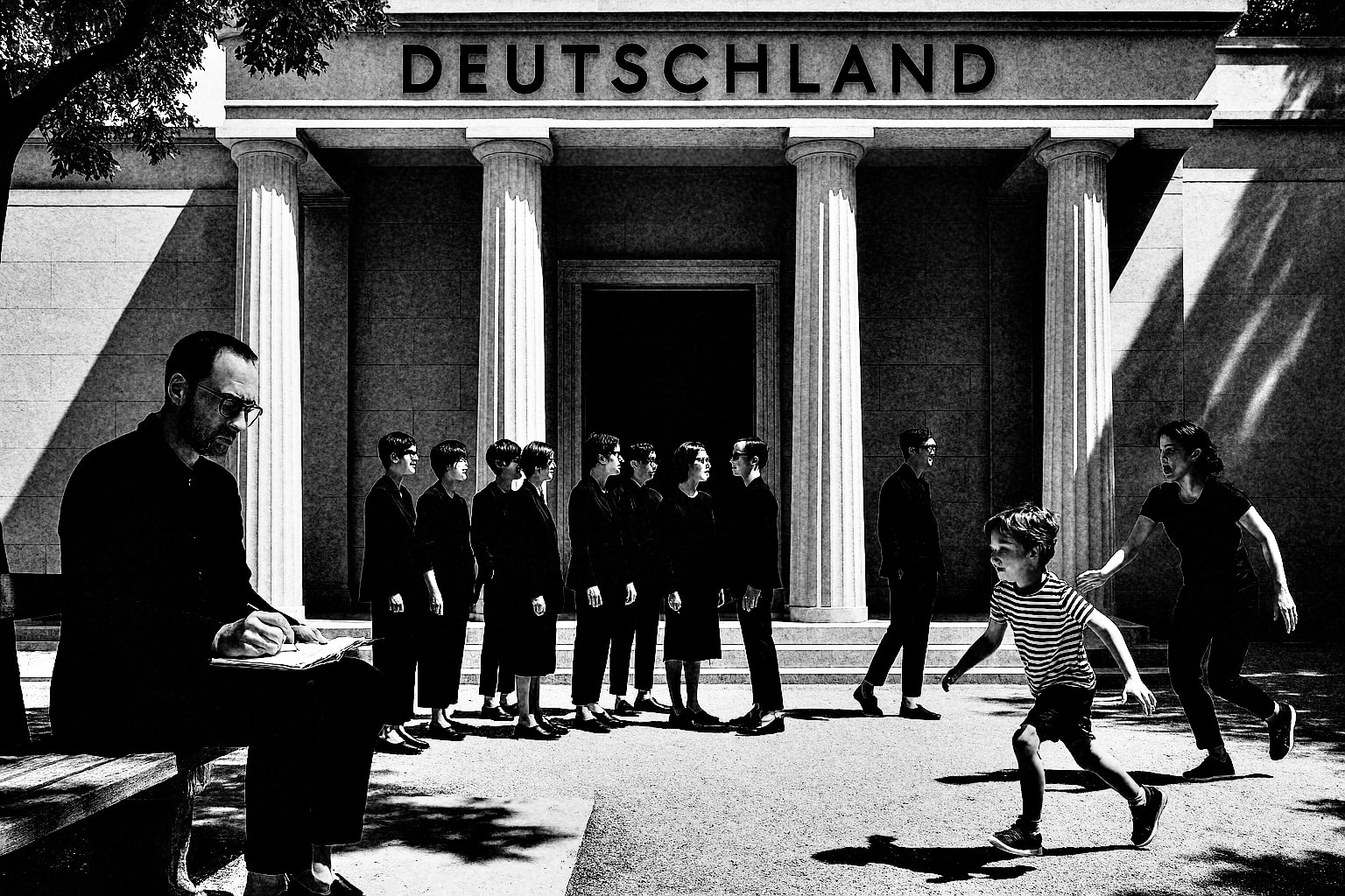 1938 hatte Hitler persönlich die Monumentalisierung angeordnet. Die Säulen breiter, die Türen höher, der Eingang wie ein offener Mund, der Größe brüllt. Seitdem arbeiten sich deutsche Künstler daran ab, als wäre das Gebäude eine Wunde, die man immer wieder aufreißen muss, damit sie nicht falsch verheilt. Haacke 1993: Boden zertrümmert, Hitler-Foto an der Wand, Goldener Löwe. Imhof 2017: Performer unter Glas, wie Insekten in einer Vitrine, Goldener Löwe. Das System frisst seine Kritiker und scheißt Preise.
